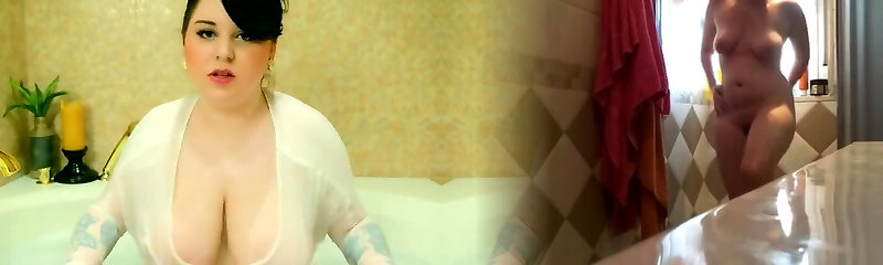 Horny plumper rubs her huge tits in the bathtub