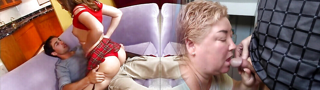Red head Oma sucks a huge black cock then bounces on it on the sofa